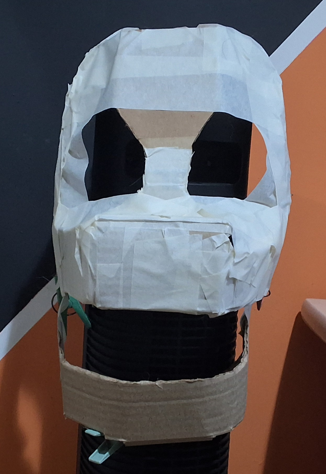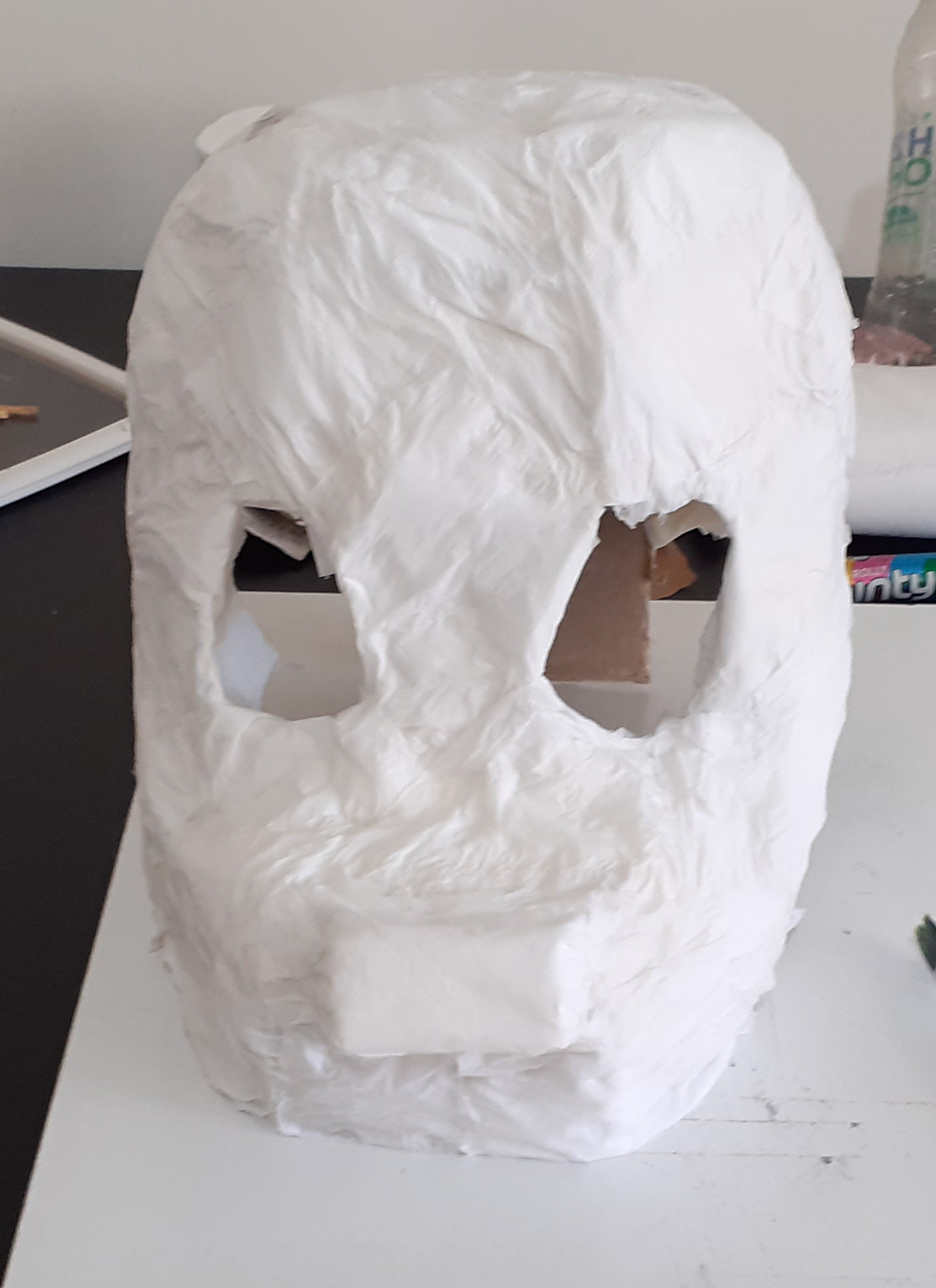 After drying it was painted with pva paint and some notebook paper white circles were glued in the eye sockets, made out of painted gauze (which turned out to be thin enough to see reasonably well!).