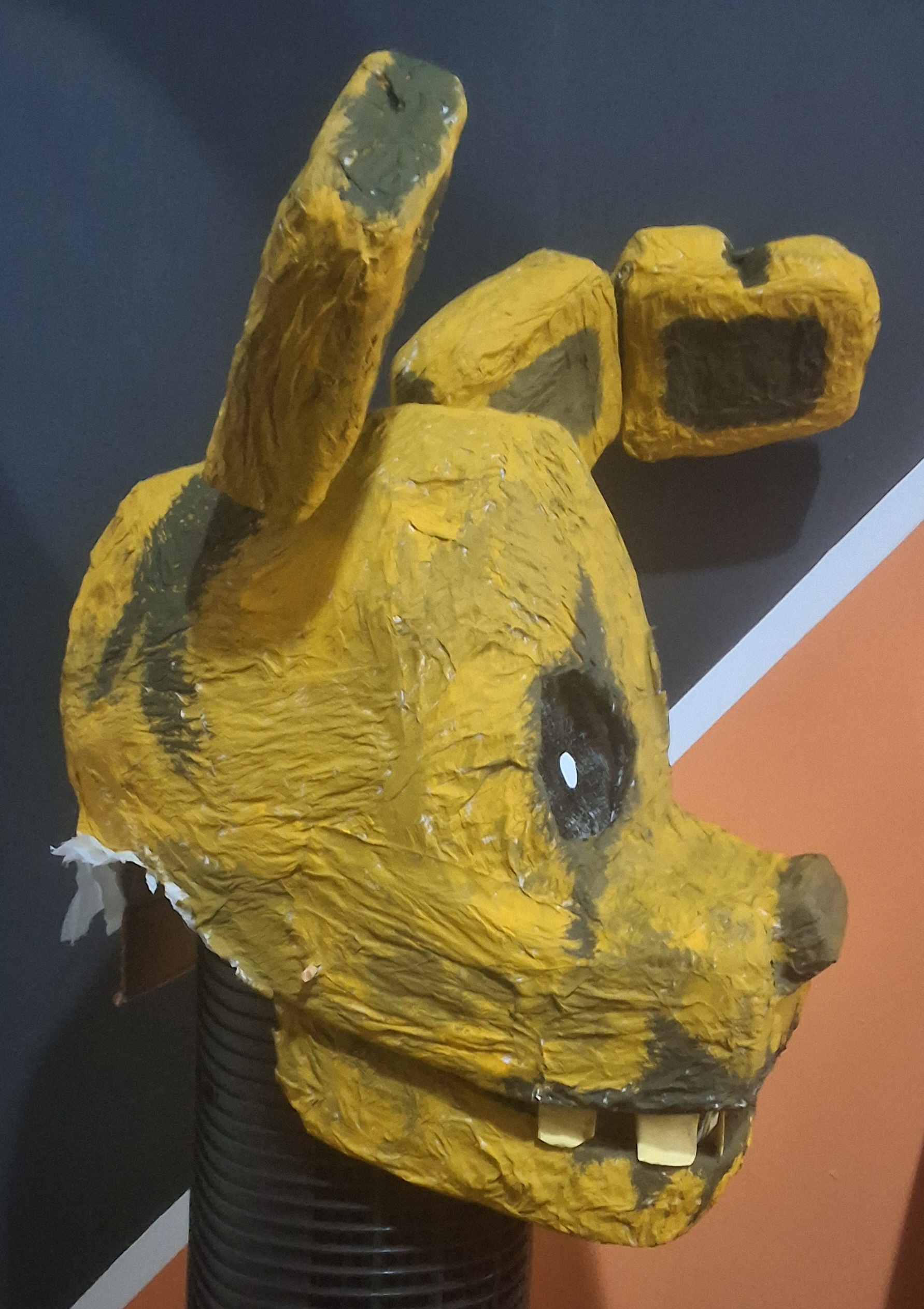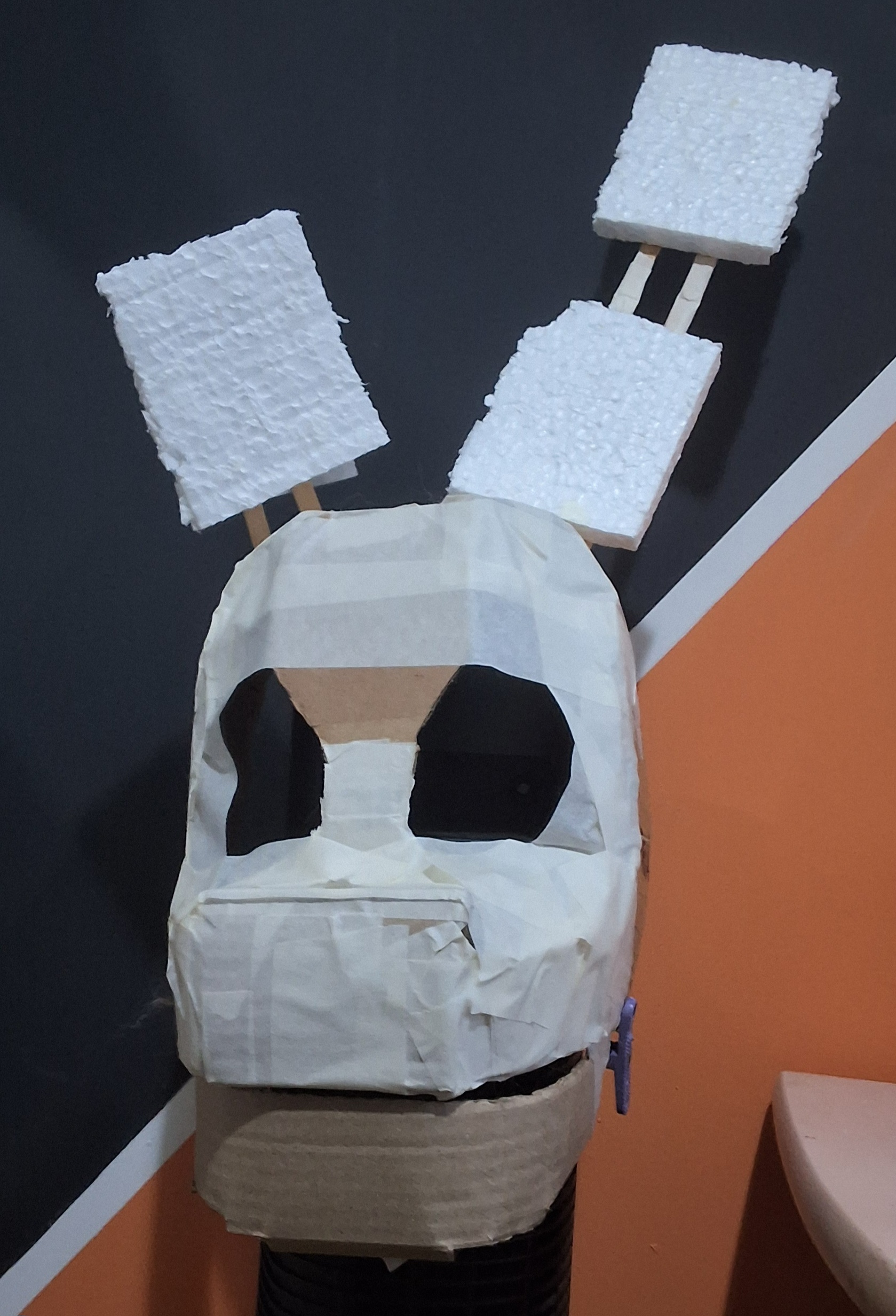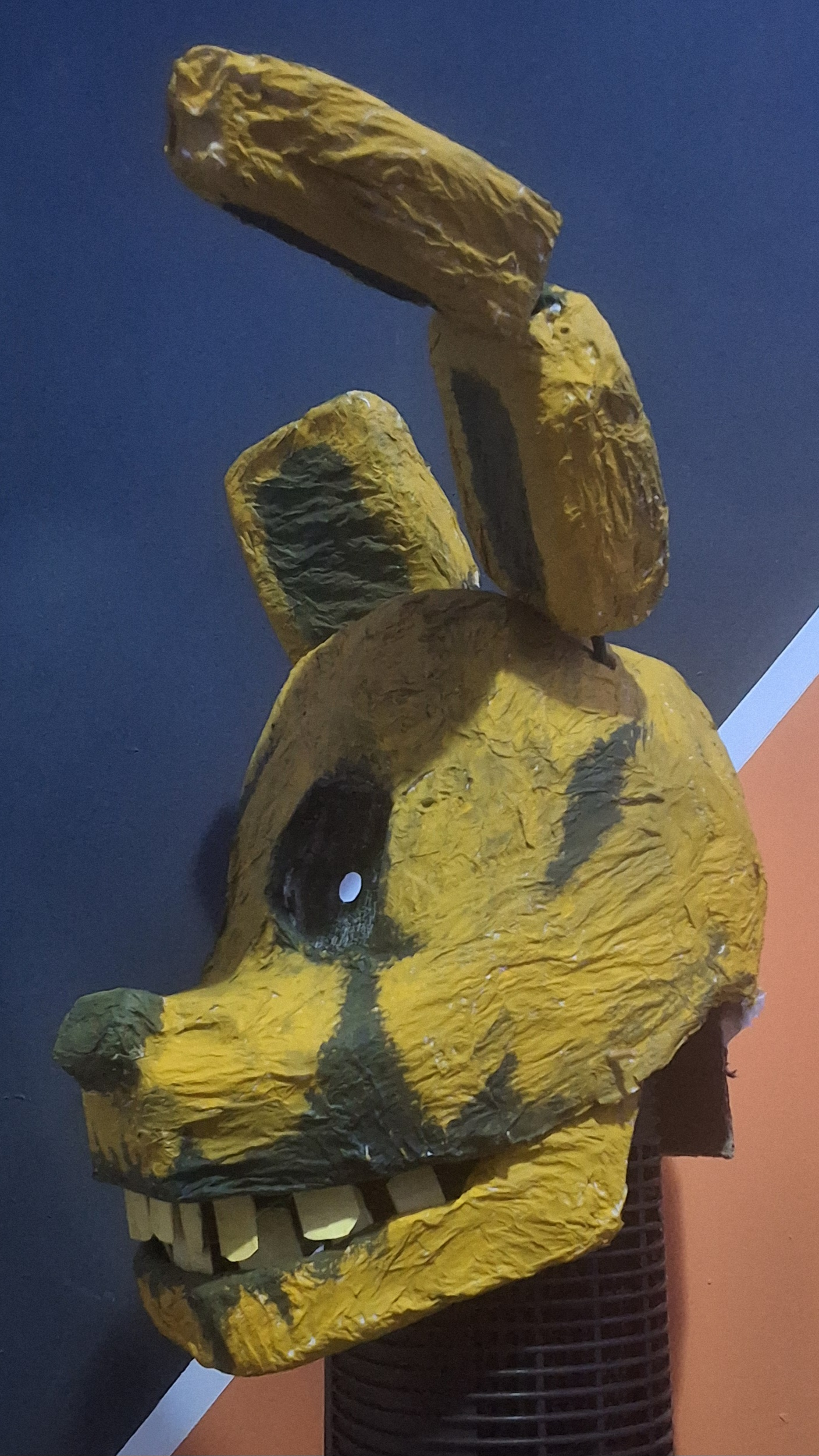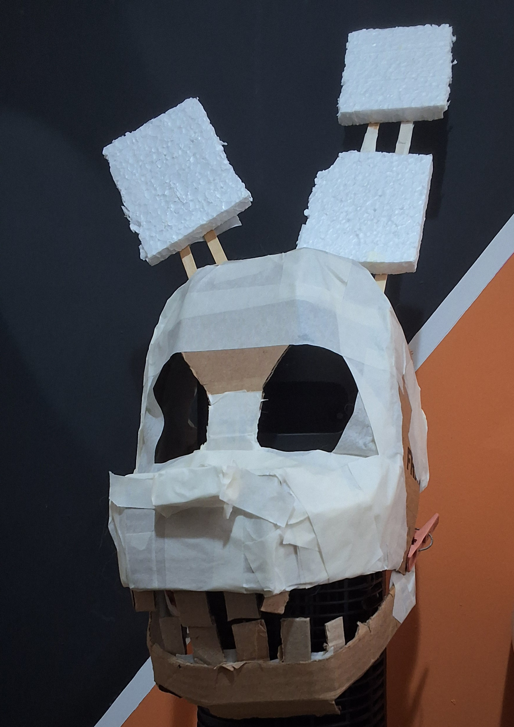 Overall a lot of things went wrong but not wrong enough to be too disappointing. Some areas had the paper strips be too thin so they ripped apart when painted, the jaw hinge sticks kept falling off as I didn't secure them because I might need to separate the jaw for repairs, the eye sockets ended up kind of wonky, the ears ended up really heavy and the popsicle sticks make it hurt to wear, the bunch of white spots from places I couldn't reach with my brush.. so on and so forth.