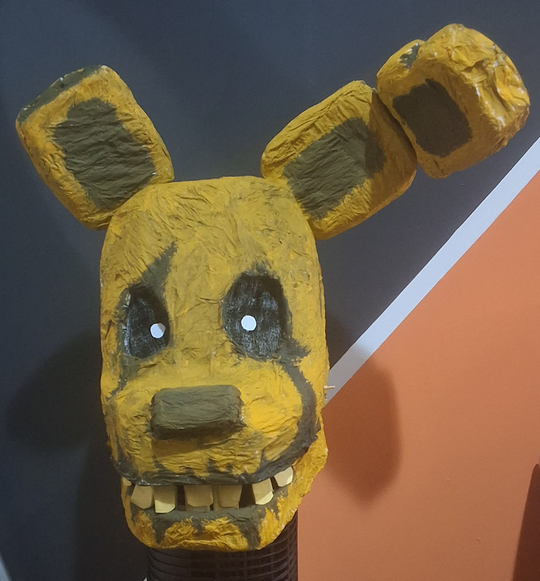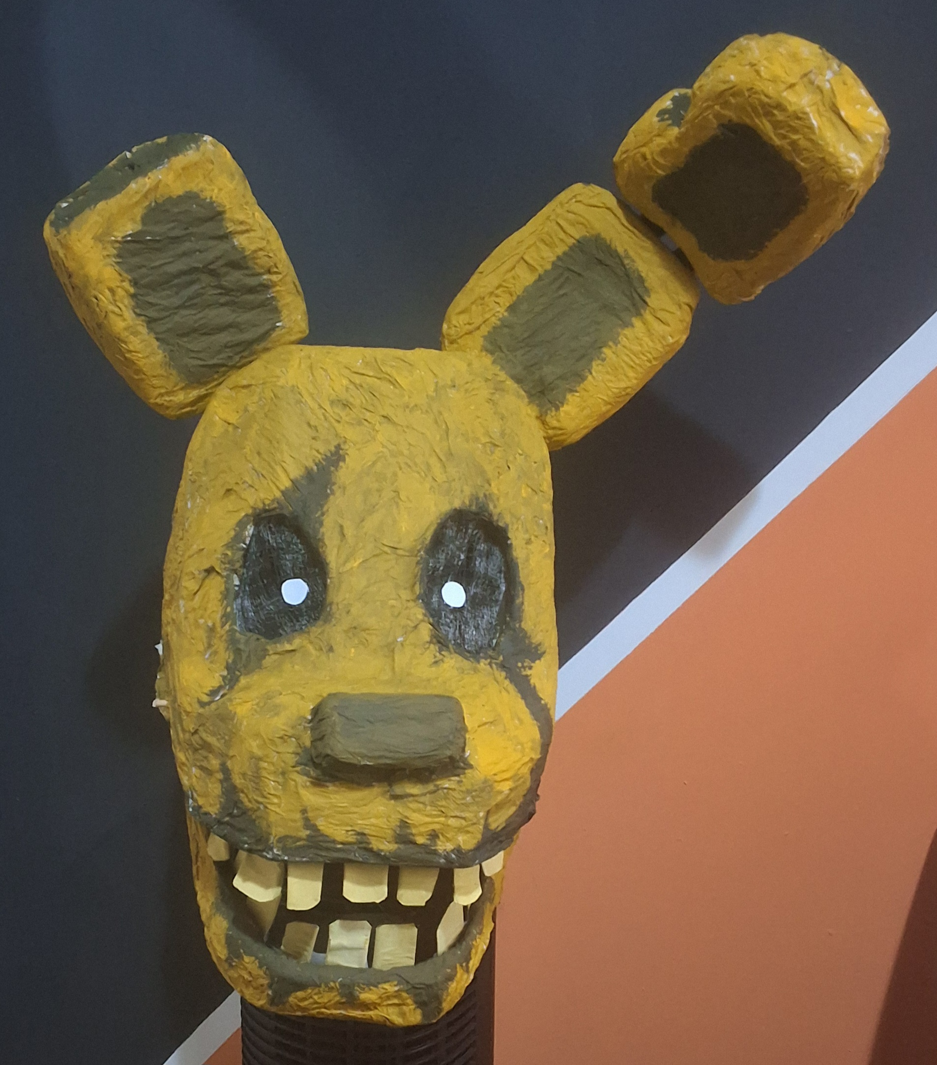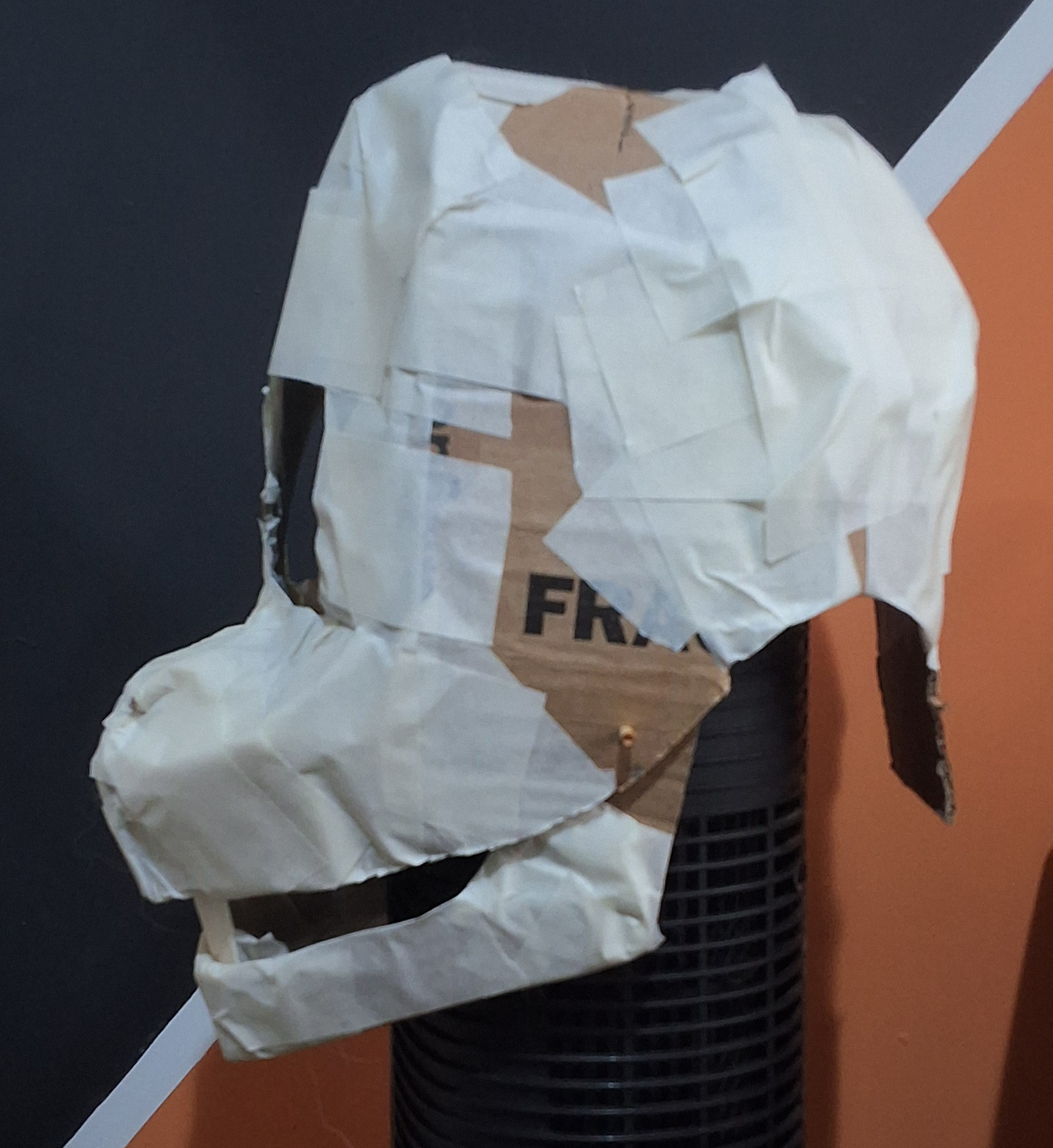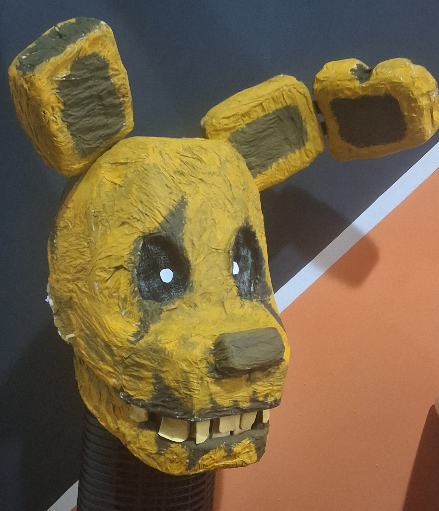 Overall a lot of things went wrong but not wrong enough to be too disappointing. Some areas had the paper strips be too thin so they ripped apart when painted, the jaw hinge sticks kept falling off as I didn't secure them because I might need to separate the jaw for repairs, the eye sockets ended up kind of wonky, the ears ended up really heavy and the popsicle sticks make it hurt to wear, the bunch of white spots from places I couldn't reach with my brush.. so on and so forth.