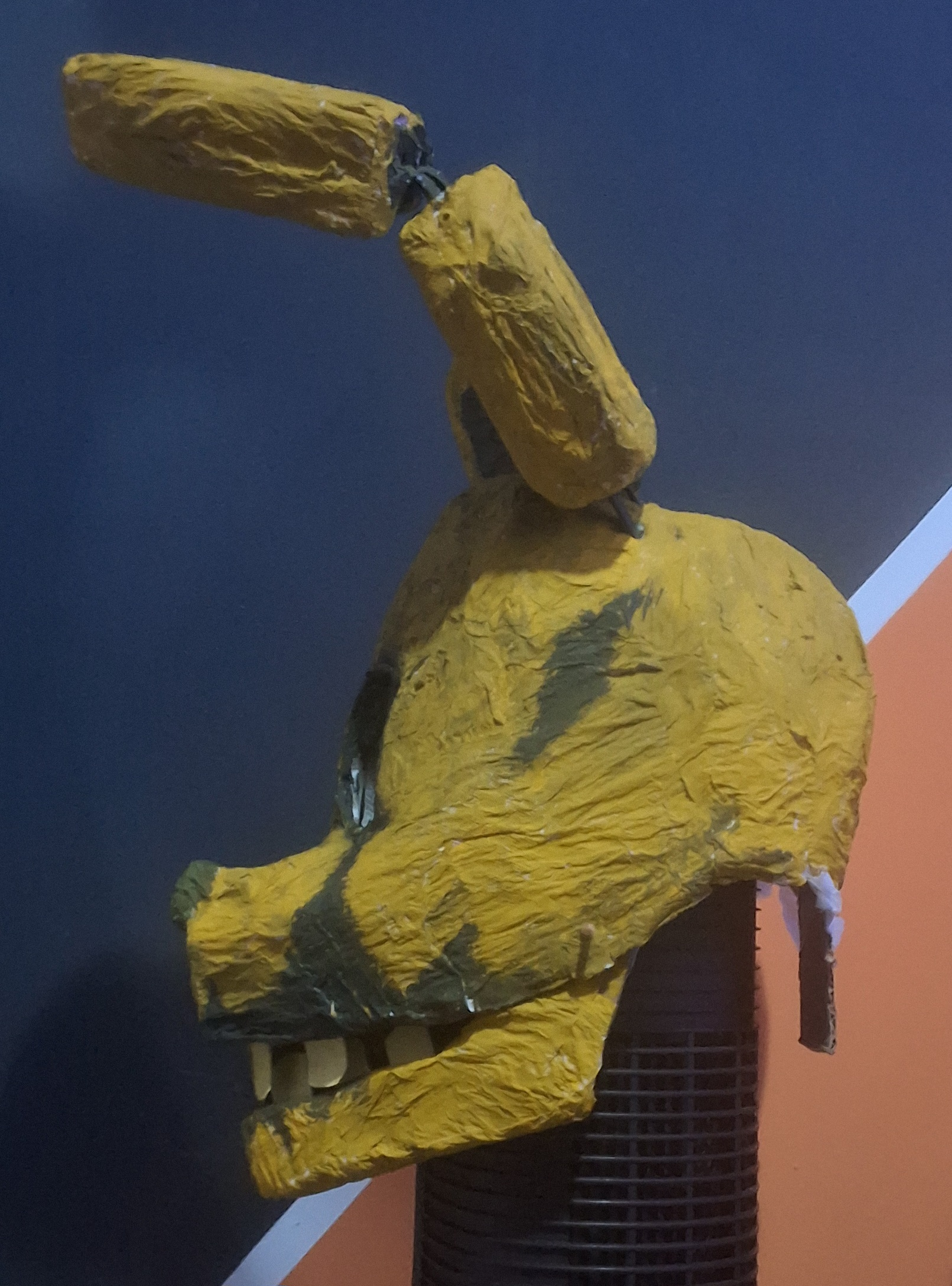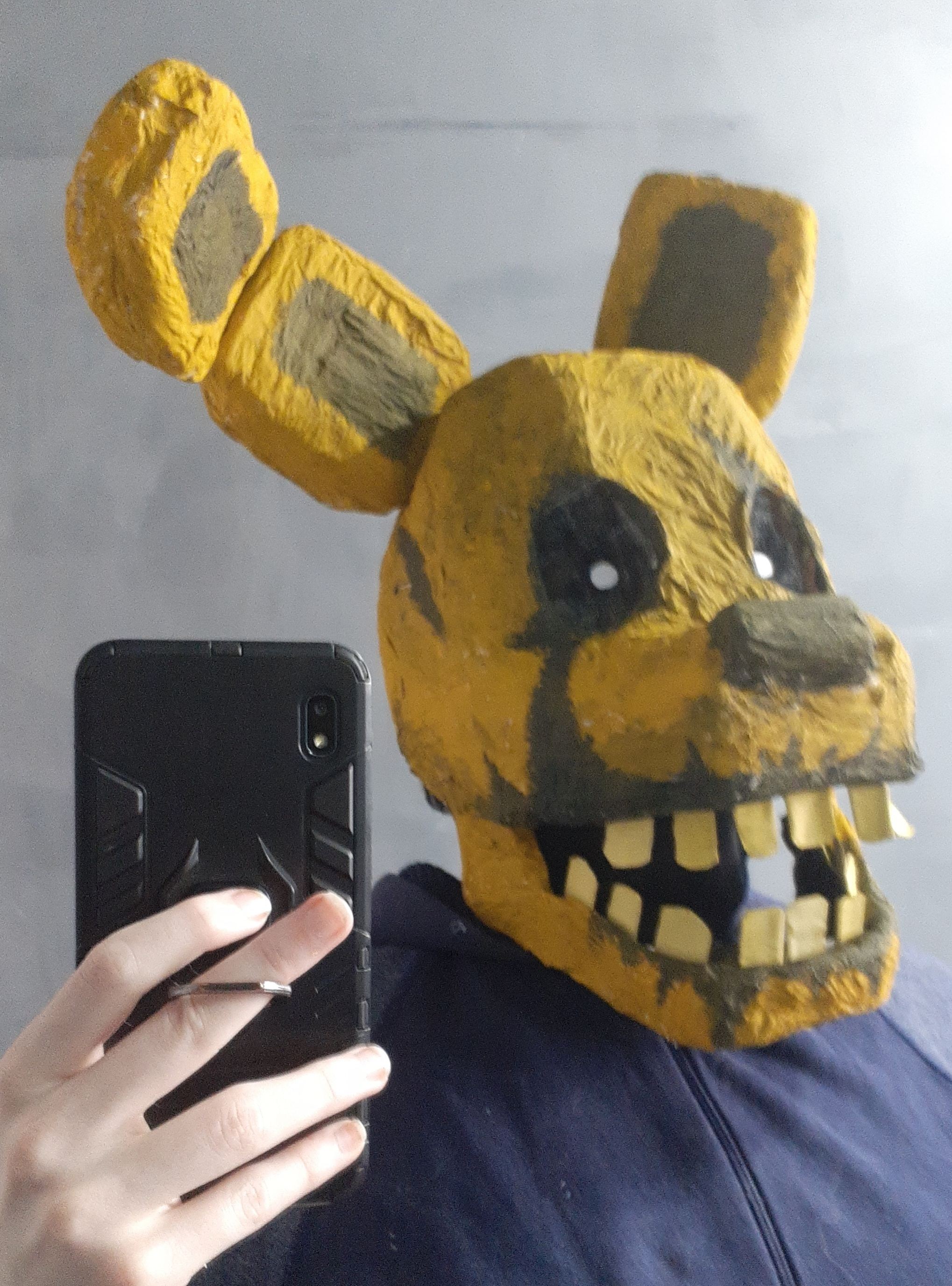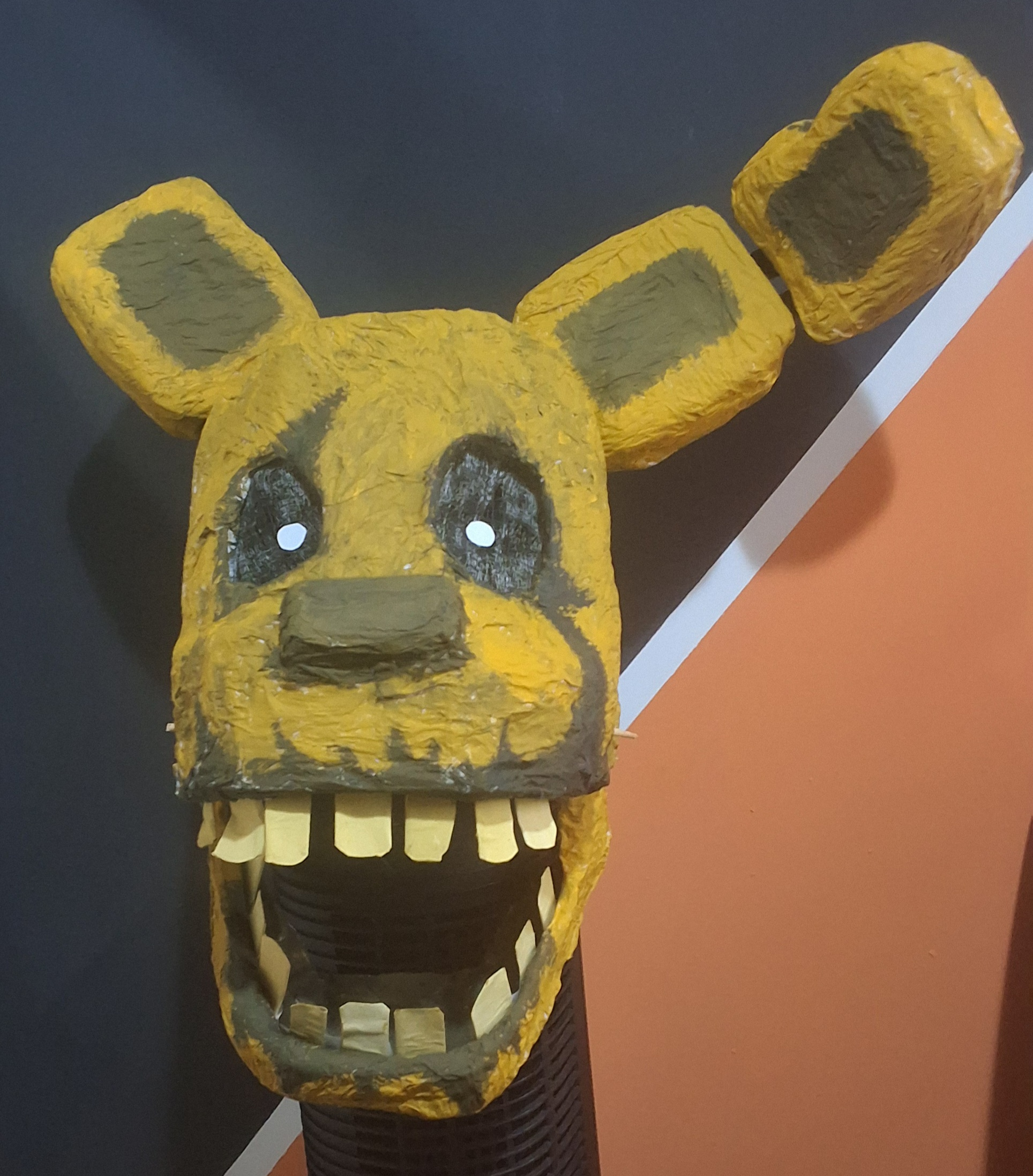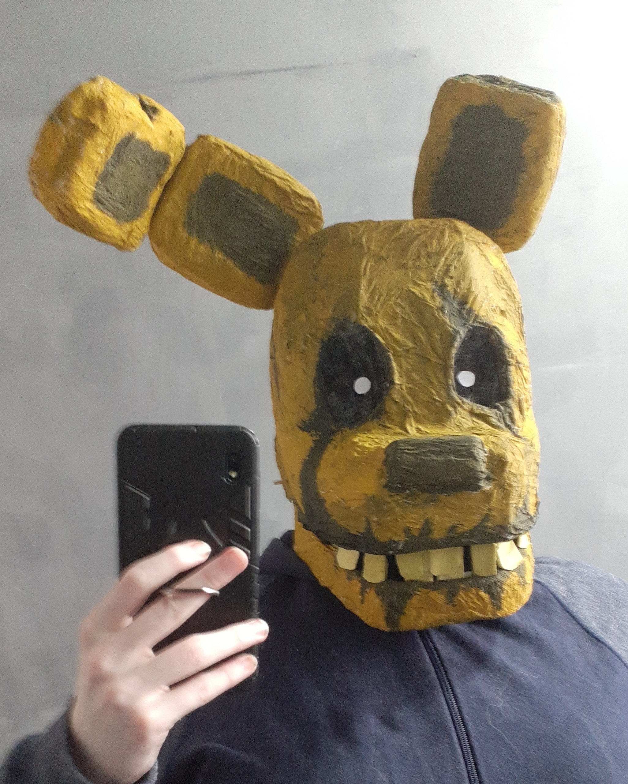 Overall a lot of things went wrong but not wrong enough to be too disappointing. Some areas had the paper strips be too thin so they ripped apart when painted, the jaw hinge sticks kept falling off as I didn't secure them because I might need to separate the jaw for repairs, the eye sockets ended up kind of wonky, the ears ended up really heavy and the popsicle sticks make it hurt to wear, the bunch of white spots from places I couldn't reach with my brush.. so on and so forth.