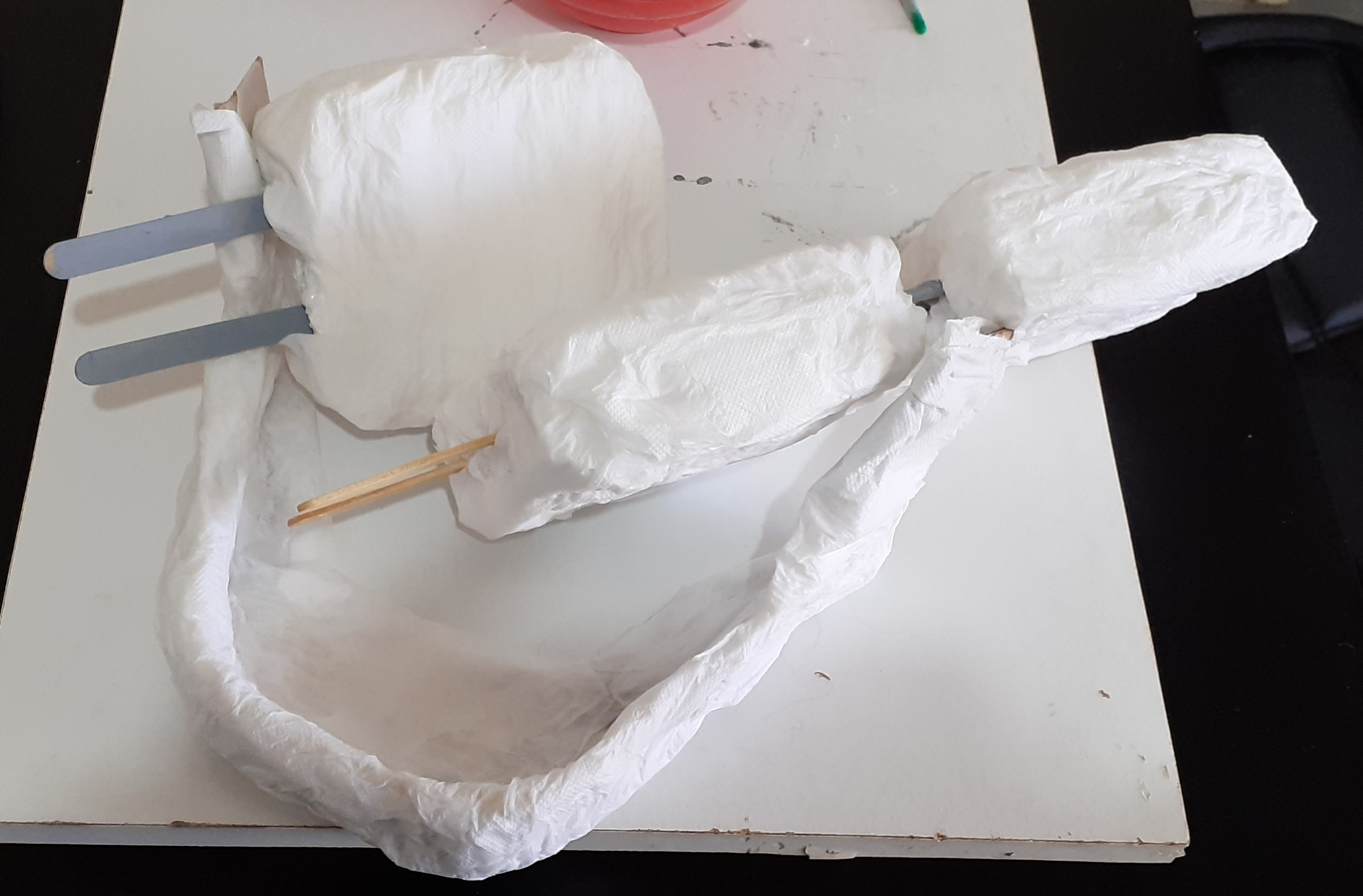 [Day 24] Drying up after being coated in toilet paper and one part water, one part white glue mixture. Originally meant to use brown packaging paper in absence of newspaper but it was not soft enough.